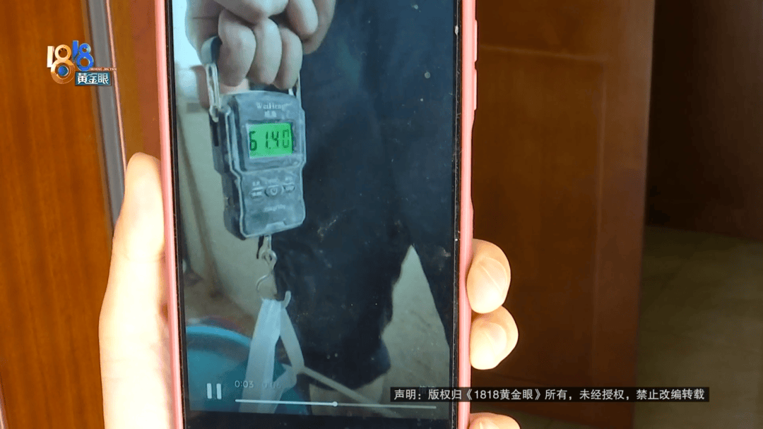 卢女士当时只拍了称重的视频,一名男子用电子秤拎着两桶胶水称重,电子秤显示总重量是61.4千克。