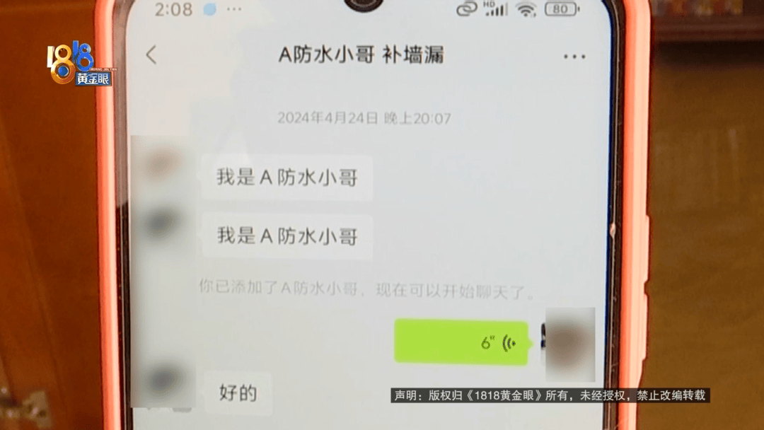 “A防水小哥 补墙漏”:她是微信上,微信上给我打的电话。